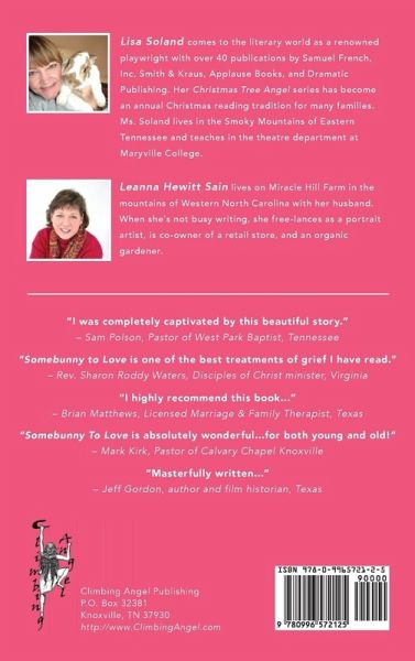 What people are saying about Somebunny To Love… "Somebunny To Love is absolutely wonderful! Somehow Lisa Soland was able to capture the true meaning of love in both a practical and Biblical way that is so simple yet so profound. Your children will not only enjoy the heartfelt story of love between a child and her pet, but they will also understand what the true meaning of love really is. I highly recommend this book for both young and old!" - Mark Kirk, Pastor of Calvary Chapel Knoxville "As is so beautifully affirmed in this story of bunnies and the humans with which they live, we tend to love that which we take care of - even if little is returned. I highly recommend this book for children who will either be taught for the first time or reinforced over time that love is a choice and, when given freely, is the only true love that exists. - Brian Matthews, Licensed Marriage & Family Therapist, Austin, Texas "Being an avid reader, I am overjoyed at each opportunity I receive to experience a new story. The special ones stay with me long after I finish reading them. Some Bunny to Love is one of those special reads. The story touches on universal experiences of loss, sadness, and the accompanying questions of 'Why,' 'Will this pain end,' and 'Where is God?' Some Bunny to Love is one of the best treatments of grief I have read. I highly recommend it as a children's book, but I believe its uplifting message will speak to many adults, as well. It is pastoral without being 'preachy' -- a true work of love, grace and beauty." - Rev. Sharon Roddy Waters, Disciples of Christ minister, Maurertown, Virginia "Somebunny to Love, the beautiful tale of a young girl and her two pet rabbits, touches upon the complexities of human emotion in a heartfelt, straightforward manner. Masterfully written, it can be appreciated by one at any stage of life, for it speaks to our ever-growing awareness of what it means to give and receive love - and how love itself endures eternally. - Jeff Gordon, author and film historian, Dallas, Texas "In Somebunny to Love, Lisa Soland creates an endearing coming of age story in which a young girl suffers the death of two rabbits and undergoes an inner struggle - in a world where pets have shorter life spans, is love worth the loss? With the help of wise parents and a strong better self, she comes to realize that the soulful risk we take for love is its own reward." - Bill Brown, poet, Nashville, Tennessee
