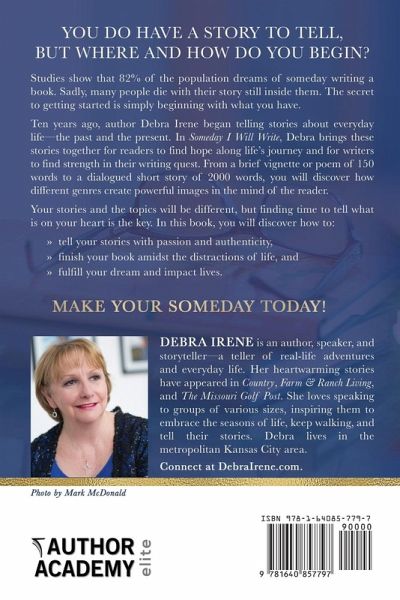 YOU DO HAVE A STORY TO TELL, BUT WHERE AND HOW DO YOU BEGIN? Studies show that 82% of the population dreams of someday writing a book. Sadly, many people die with their story still inside them. The secret to getting started is simply beginning with what you have. Ten years ago, author Debra Irene began telling stories about everyday life—the past and the present. In Someday I Will Write, Debra brings these stories together for readers to find hope along life’s journey and for writers to find strength in their writing quest. From a brief vignette or poem of 150 words to a dialogued short story of 2000 words, you will discover how different genres create powerful images in the mind of the reader. Your stories and the topics will be different, but finding time to tell what is on your heart is the key. In this book, you will discover how to: tell your stories with passion and authenticity, finish your book amidst the distractions of life, and fulfill your dream and impact lives. MAKE YOUR SOMEDAY TODAY!