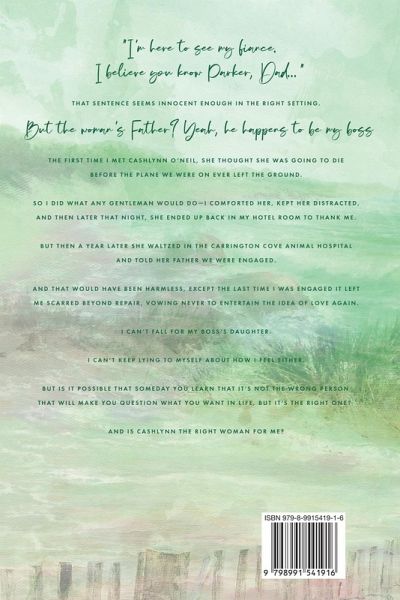 "I'm here to see my fiancé. I believe you know Parker, Dad..." That sentence seems innocent enough in the right setting. But the woman's father? Yeah, he happens to be my boss. The first time I met Cashlynn O'Neil, she thought she was going to die before the plane we were on ever left the ground. So I did what any gentleman would do-I comforted her, kept her distracted, and then later that night, she ended up back in my hotel room to thank me. But then a year later she waltzed in the Carrington Cove Animal Hospital and told her father we were engaged. And that would have been harmless, except the last time I was engaged it left me scarred beyond repair, vowing never to entertain the idea of love again. I can't fall for my boss's daughter. I can't keep lying to myself about how I feel either. But is it possible that someday you learn that it's not the wrong person that will make you question what you want in life, but it's the right one? And is Cashlynn the right woman for me?