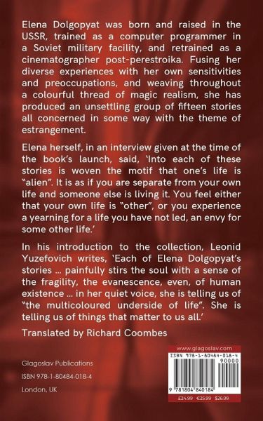 Elena Dolgopyat was born and raised in the USSR, trained as a computer programmer in a Soviet military facility, and retrained as a cinematographer post-perestroika. Fusing her diverse experiences with her own sensitivities and preoccupations, and weaving throughout a colourful thread of magic realism, she has produced an unsettling group of fifteen stories all concerned in some way with the theme of estrangement. Elena herself, in an interview given at the time of the book's launch, said, "Into each of these stories is woven the motif that one's life is 'alien'. It is as if you are separate from your own life and someone else is living it. You feel either that your own life is 'other', or you experience a yearning for a life you have not led, an envy for some other life." In his introduction to the collection, Leonid Yuzefovich writes, "Each of Elena Dolgopyat's stories ... painfully stirs the soul with a sense of the fragility, the evanescence, even, of human existence ... in her quiet voice, she is telling us of "the multicoloured underside of life". She is telling us of things that matter to us all."