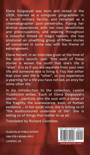 Elena Dolgopyat was born and raised in the USSR, trained as a computer programmer in a Soviet military facility, and retrained as a cinematographer post-perestroika. Fusing her diverse experiences with her own sensitivities and preoccupations, and weaving throughout a colourful thread of magic realism, she has produced an unsettling group of fifteen stories all concerned in some way with the theme of estrangement. Elena herself, in an interview given at the time of the book's launch, said, "Into each of these stories is woven the motif that one's life is 'alien'. It is as if you are separate…mehr