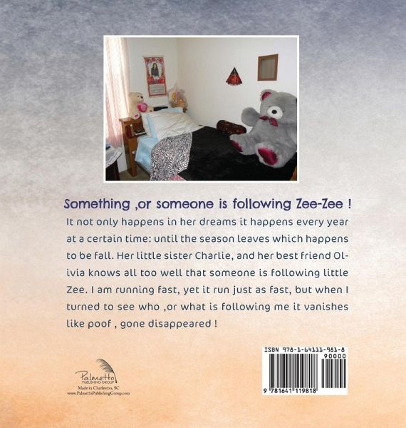 Something, or someone is following Zee-Zee! It not only happens in her dreams it happens every year at a certain time, the season leaves, which happens to be fall. Her little sister Charlie, and her best friend Olivia know all too well that someone is following little Zee. I am running fast, yet it runs just as fast, but when I turned to see who, or what is following me, it vanishes like poof...gone...disappeared!