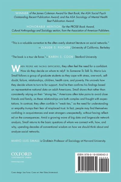 Winner of the James Coleman Award for Best Book from the Rationality and Society section of the American Sociological Society Winner of the Outstanding Recent Contribution from the Social Psychology section of the American Sociological Association Winner of the Best Publication Award from the Mental Health section of the American Sociological Association Honorable Mention, PROSE Book Award, Cultural Anthropology and Sociology, from the Association of American Publishers When people are facing difficulties, they often feel the need for a confidant. How do they decide on whom to rely? In Someone To Talk To, Mario Luis Small follows a group of graduate students as they cope with stress, overwork, self-doubt, failure, relationships, children, health care, and poverty. He unravels how they decide whom to turn to for support. And he then confirms his findings based on representative national data on adult Americans. Small shows that rather than consistently relying on their "strong ties," Americans often take pains to avoid close friends and family, as these relationships are both complex and fraught with expectations. In contrast, they often confide in "weak ties," as the need for understanding or empathy trumps their fear of misplaced trust. In fact, people may find themselves confiding in acquaintances and even strangers unexpectedly, without having reflected on the consequences. Amid a growing wave of big data and large-scale network analysis, Small returns to the basic questions of whom we connect with, how, and why, upending decades of conventional wisdom on how we should think about and analyze social networks.