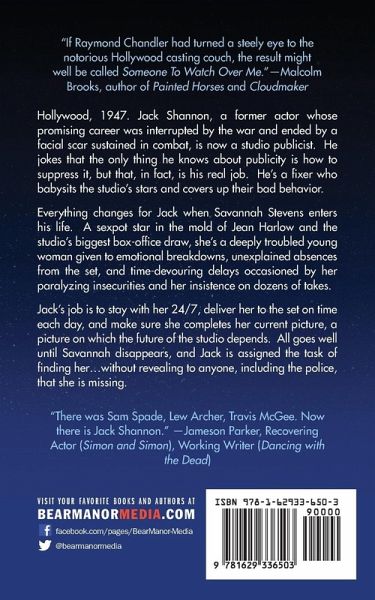 "If Raymond Chandler had turned a steely eye to the notorious Hollywood casting couch, the result might well be called Someone To Watch Over Me." -Malcolm Brooks, author of Painted Horses and Cloudmaker Hollywood, 1947. Jack Shannon, a former actor whose promising career was interrupted by the war and ended by a facial scar sustained in combat, is now a studio publicist. He jokes that the only thing he knows about publicity is how to suppress it, but that, in fact, is his real job. He's a fixer who babysits the studio's stars and covers up their bad behavior.Everything changes for Jack when Savannah Stevens enters his life. A sexpot star in the mold of Jean Harlow and the studio's biggest box-office draw, she's a deeply troubled young woman given to emotional breakdowns, unexplained absences from the set, and time-devouring delays occasioned by her paralyzing insecurities and her insistence on dozens of takes. Jack's job is to stay with her 24/7, deliver her to the set on time each day, and make sure she completes her current picture, a picture on which the future of the studio depends. All goes well until Savannah disappears, and Jack is assigned the task of finding her...without revealing to anyone, including the police, that she is missing."There was Sam Spade, Lew Archer, Travis McGee. Now there is Jack Shannon." -Jameson Parker, Recovering Actor (Simon and Simon), Working Writer (Dancing with the Dead)