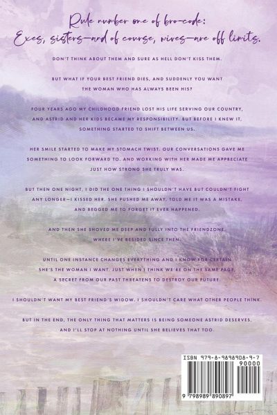 Rule number one of bro-code: exes, sisters-and of course, wives-are off-limits. Don't think about them and sure as hell don't kiss them. But what if your best friend dies, and suddenly you want the woman who has always been his? Four years ago my childhood friend lost his life serving our country, and Astrid and her kids became my responsibility. But before I knew it, something started to shift between us. Her smile started to make my stomach twist. Our conversations gave me something to look forward to. And working with her made me appreciate just how strong she truly was. But then one night, I did the one thing I shouldn't have but couldn't fight any longer-I kissed her. She pushed me away, told me it was a mistake, and begged me to forget it ever happened. And then she shoved me deep and fully into the friendzone, where I've resided since then. Until one instance changes everything and I know for certain she's the woman I want. Just when I think we're on the same page, a secret from our past threatens to destroy our future. I shouldn't want my best friend's widow. I shouldn't care what other people think. But in the end, the only thing that matters is being someone Astrid deserves, and I'll stop at nothing until she believes that too.