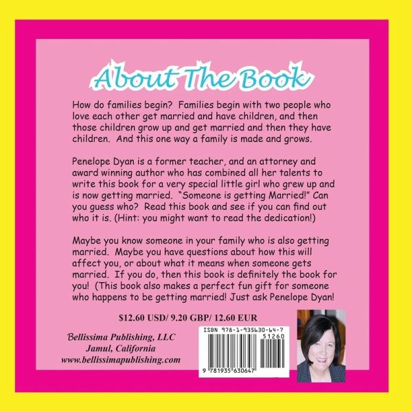 Do you know someone who is getting married? People get married all the time, and weddings are lots of fun. But it doesn't mean whoever is getting married is going away forever. They will still be the very same person right there to love you just like they did before they got married. So if someone in your life is getting married, please do not worry, because they will love you just as much as they always have, no matter what. This book uses the concept of marriage to tell a little story about one girl who dreamed of getting married someday and of finding that right person to marry. Now while marriage may not be as popular a concept as it once was, it is still a glorious thing to do, getting married that is. And you can use this book to start your very own discussion on the subject. Written in simple poetry and illustrated in kid-friendly Penelope Dyan style, this award winning author and poet tells a story like no one else can, and Bellissima promises you will again smile and laugh when you read this book that was written for a very special little girl Penelope Dyan saw grow up right before her eyes! The girl's name is Hailey. This book is dedicated to her and to her parents and was written for them as a very special surprise. "Someone's Getting Married" can be given as a gift to someone you know and love who is getting married, or it can be used to discuss the concept of marriage and to get a dialog going on the subject with your child. This is a faith based book that includes the concept of God's plan for us all. (There is also a free Bellissimavideo video that goes with this book on 'YouTube' "Baby I'm Yours" sung by Penelope Dyan. Use it with this book to further the discussion and learning experience.)