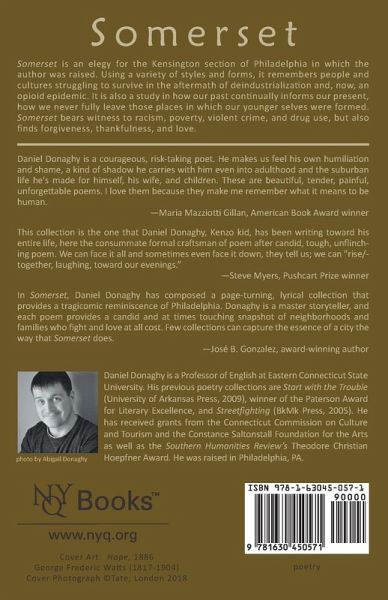 Somerset is an elegy for the Kensington section of Philadelphia in which the author was raised. Using a variety of styles and forms, it remembers people and cultures struggling to survive in the aftermath of deindustrialization and, now, an opioid epidemic. It is also a study in how our past continually informs our present, how we never fully leave those places in which our younger selves were formed. Somerset bears witness to racism, poverty, violent crime, and drug use, but also finds forgiveness, thankfulness, and love.