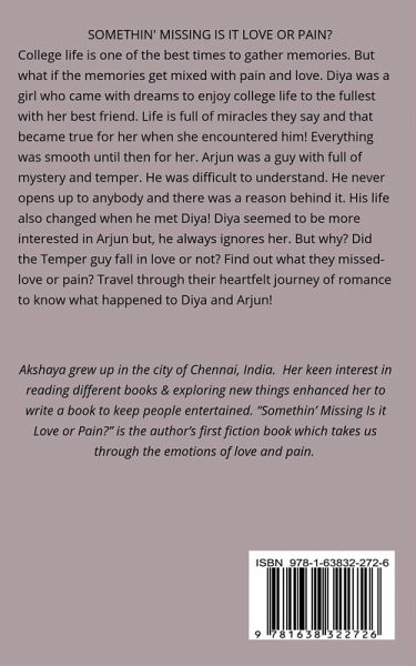 College life is one of the best times to gather memories. But what if the memories get mixed with pain and love. Diya was a girl who came with dreams to enjoy college life to the fullest with her best friend. Life is full of miracles they say and that became true for her when she encountered him! Everything was smooth until then for her.Arjun was a guy with full of mystery and temper. He was difficult to understand. He never opens up to anybody and there was a reason behind it. His life also changed when he met Diya!Diya seemed to be more interested in Arjun but, he always ignores her. But why? Did the Temper guy fall in love or not? Find out what they missed- love or pain? Travel through their heartfelt journey of romance to know what happened to Diya and Arjun!