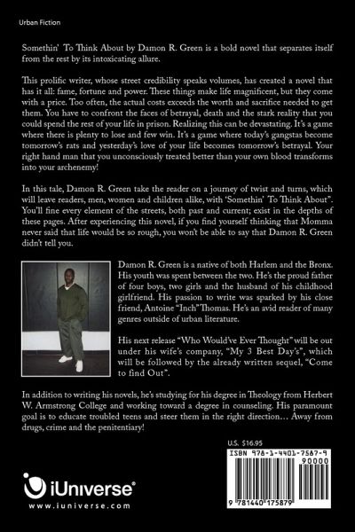 Somethin' to Think About by Damon R Green is a bold novel that separates itself from the rest by its intoxicating allure. This prolific writer, whose street credibility speaks volumes, has created a novel that has it all: fame, fortune and power. These things make life magnificent, but they come with a price. Too often, the actual costs exceeds the worth and sacrifice needed to get them. You have to confront the faces of betrayal, death and the stark reality that you could spend the rest of your life in prison. Realizing this can be devastating. It's a game where there is plenty to lose and few win. It's a game where today's gangstas become tomorrow's rats and yesterday's love of your life becomes tomorrow's betrayal. Your right hand man that you unconsciously treated better than your own blood transforms into your archenemy! In this tale, Damon R. Green take the reader on a journey of twist and turns, which will leave readers, men, women and children alike, with 'Somethin' to Think About". You'll fine every element of the streets, both past and current; exist in the depths of these pages. After experiencing this novel, if you find yourself thinking that Momma never said that life would be so rough, you won't be able to say that Damon R. Green didn't tell you.