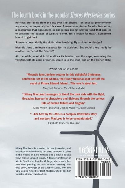 Herrings are falling from the sky over The Shores–an unusual phenomenon anywhere, but especially so in this case. A newcomer, Anton Paradis, has set up a restaurant that specializes in dangerous dining, cooking up food that can kill to tantalize the palates of wealthy clients. It's a recipe for death. Someone's bound to get hurt. Someone does. Oddly, the victim dies laughing. By accident or design? Mountie Jane Jamieson suspects it's no accident. But could there really be another murder at The Shores? All the while, a wind turbine slices its blades over the cape, menacing the villagers with its eerie presence. Death is in the wind as well as on the dinner plate.
