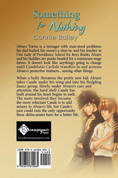 Alvaro Torres is a teenager with man-sized problems: his dad bailed, his mom's a shut-in, and his teacher at Our Lady of Providence School for Boys thinks Alvaro and his buddies are punks headed for a minimum-wage future. It doesn't look like anything's going to change until Candelario Carlisle transfers in and arouses Alvaro's protective instincts... among other things. When a bully threatens the pretty new kid, Alvaro takes Cande under his wing and into his fledgling dance group. Slowly, under Alvaro's care and attention, the hard shell Cande has built around his heart begins to melt. The more involved they become, the more reluctant Cande is to add misery to Alvaro's life, but Cande's past could ruin the only opportunity these delincuentes have for a better life.
