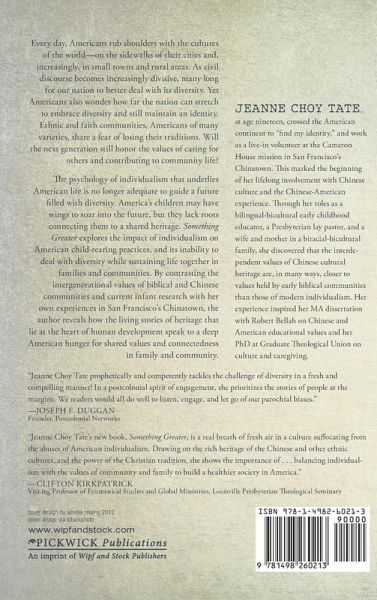 Every day, Americans rub shoulders with the cultures of the world--on the sidewalks of their cities and, increasingly, in small towns and rural areas. As civil discourse becomes increasingly divisive, many long for our nation to better deal with its diversity. Yet Americans also wonder how far the nation can stretch to embrace diversity and still maintain an identity. Ethnic and faith communities, Americans of many varieties, share a fear of losing their traditions. Will the next generation still honor the values of caring for others and contributing to community life? The psychology of individualism that underlies American life is no longer adequate to guide a future filled with diversity. America's children may have wings to soar into the future, but they lack roots connecting them to a shared heritage. Something Greater explores the impact of individualism on American child-rearing practices, and its inability to deal with diversity while sustaining life together in families and communities. By contrasting the intergenerational values of biblical and Chinese communities and current infant research with her own experiences in San Francisco's Chinatown, the author reveals how the living stories of heritage that lie at the heart of human development speak to a deep American hunger for shared values and connectedness in family and community.