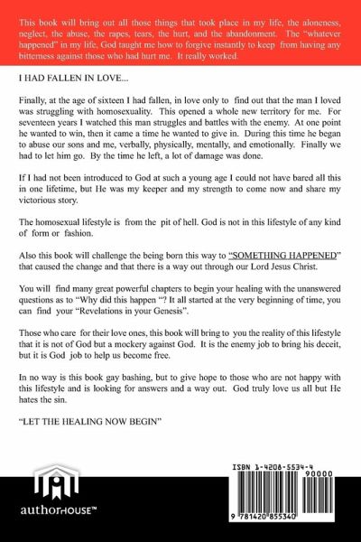 This book will bring out all those things that took place in my life, the aloneness, neglect, the abuse, the rapes, tears, the hurt, and the abandonment. The "whatever happened" in my life, God taught me how to forgive instantly to keep from having any bitterness against those who had hurt me. It really worked. I HAD FALLEN IN LOVE... Finally at the age of sixteen I fallen in love only to find out that the man I love was struggling with homosexuality. This opened a whole new territory for me. For seventeen years I watch this man struggles and battles with the enemy. At one point he wanted to win, then it came a time he wanted to give in. During this time he began to abuse my sons and I, verbally, physically, mentally, and emotionally. Finally we had to let him go. By the time he left, a lot of damage was done. If I had not been Introduce to God at such a young age I could not have bared all this in one lifetime, but He was my keeper and my strength to come now and share my victorious story. The homosexual lifestyle is from the pit of hell God is not in this lifestyle of any kind of form or fashion. Also this book will challenge the being born this way to "SOMETHING HAPPENED" that caused the change and that there is a way out through our Lord Jesus Christ. You will find many great powerful chapters to begin your healing with the unanswered questions as to "Why did this happen "? It all started at the very beginning of time, you can find your "Revelations in your Genesis". Those who care for their love ones, this book will bring to you the reality of this lifestyle that it is not of God but a mockery against God. It is the enemy job to bring his deceit, but it is God job to help us become free. In no way is this book gay bashing, but to give hope to those who are not happy with this lifestyle and is looking for answers and a way out. God truly love us all but He hates the sin. "LET THE HEALING NOW BEGIN"