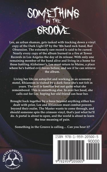 Lee, an urban shaman, gets tasked with tracking down a vinyl copy of the Dark Light EP by the '80s hard rock band, Bad Obsession. The extremely rare record is said to be cursed. Nearly every copy of the album burned in a fire at Tower Records in Los Angeles the day of its release. With only one remaining member of the band alive and living in a home for those battling Alzheimer's, Lee must return to Maine, a place where he's battled evil forces before, and see if he can retrieve the album. Living her life on autopilot and working in an economy motel, Rhiannon is visited by a dark force she's not felt in years. The evil is familiar but not quite what she remembered. This is something else. In over her head, she calls out for Lee, hoping her old friend can hear her. Brought back together by a force beyond anything either has dealt with prior, Lee and Rhiannon must combat powers beyond their realm. The Master wants to come through, and should someone spin the crimson vinyl, that's just what he'll do. A portal is about to open, and the world is about to learn the true meaning of pain. Something in the Groove is calling… Can you hear it?