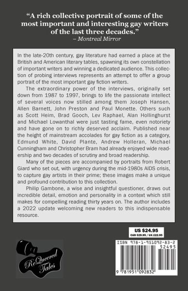 In the late-20th century, gay literature had earned a place at the British and American literary tables, spawning its own constellation of important writers and winning a dedicated audience. This collection of probing interviews represents an attempt to offer a group portrait of the most important gay fiction writers. The extraordinary power of the interviews, originally set down from 1987 to 1997, brings to life the passionate intellect of several voices now stilled among them Joseph Hansen, Allen Barnett, John Preston and Paul Monette. Others such as Scott Heim, Brad Gooch, Lev Raphael, Alan Hollinghurst and Michael Lowanthal were just tasting fame, even notoriety and have gone on to richly deserved acclaim. Published near the height of mainstream accolades for gay fiction as a category, Edmund White, David Plante, Andrew Holleran, Michael Cunningham and Christopher Bram had already enjoyed wide readership and two decades of scrutiny and broad readership. Many of the pieces are accompanied by portraits from Robert Giard who set out, with urgency during the mid-1980s AIDS crisis, to capture gay artists in their prime; these images make a unique and profound contribution to this collection. Philip Gambone, a wise and insightful questioner, draws out incredible detail, emotion and personality in a context which still makes for compelling reading thirty years on. The author includes a 2022 update welcoming new readers to this indispensable resource. ¿¿"A welcome compilation of interviews Gambone has conducted with 21 gay writers since 1987, this collection amounts to a compelling portrait gallery of many influential figures. Gambone's knowledge of each writer's work and his sensitivity to the craft is impressive ... his carefully probing interviews provide insight into the working methods and aesthetic, personal and social concerns of a varied group, including such well-known writers as well as those who emerged in the late 1980s and 1990s. The book amounts to a broad overview of the 'breathlessly rapid' development of gay fiction and its themes, from early coming-out novels to more complex visions of a world. Many of the writers stress how important it is for them to feel the freedom to depict their world honestly." - Publishers Weekly "Gambone's collection of interviews is a valuable addition to the ever-growing corpus in gay studies / queer theory. It poses far more questions than it does answers and relishes in the contradictions that emerge in intellectual conversations with writers and their craft." - Rocky Mountain Review of Language and Literature "A rich collective portrait of some of the most important and interesting gay writers of the last three decades." - Montreal Mirror "Gambone's interviews reveal the human side of authors it is often too easy to think about only in terms of book titles and awards received, and remind us that those who write about our world inhabit it themselves." - Michael Thomas Ford, Lambda Book Report "Gambone, an award-winning essayist, journalist, and fiction writer, elicits animated, revealing, and even warm answers to his questions about their writing lives; eschewing gossipy topics, he sticks to literary matters, particularly opinions of, and notions of their own place in, the gay literary movement." - Brad Hooper, Booklist
