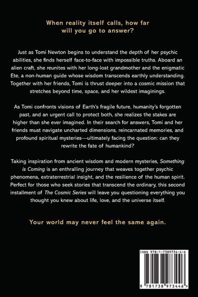 When reality itself calls, how far will you go to answer? Just as Tomi Newton begins to understand the depth of her psychic abilities, she finds herself face-to-face with impossible truths. Aboard an alien craft, she reunites with her long-lost grandmother and the enigmatic Ete, a non-human guide whose wisdom transcends earthly understanding. Together with her friends, Tomi is thrust deeper into a cosmic mission that stretches beyond time, space, and her wildest imaginings. As Tomi confronts visions of Earth's fragile future, humanity's forgotten past, and an urgent call to protect both, she realizes the stakes are higher than she ever imagined. In their search for answers, Tomi and her friends must navigate uncharted dimensions, reincarnated memories, and profound spiritual mysteries-ultimately facing the question: can they rewrite the fate of humankind? Taking inspiration from ancient wisdom and modern mysteries, Something is Coming is an enthralling journey that weaves together psychic phenomena, extraterrestrial insight, and the resilience of the human spirit. Perfect for those who seek stories that transcend the ordinary, this second installment of The Cosmic Series will leave you questioning everything you thought you knew about life, love, and the universe itself. Your world may never feel the same again.