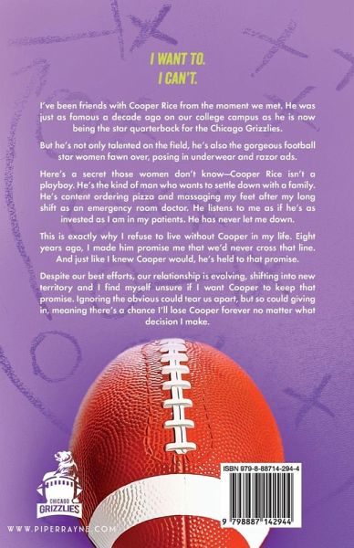I want to. I can't. I've been friends with Cooper Rice from the moment we met. He was just as famous a decade ago on our college campus as he is now being the star quarterback for the Chicago Grizzlies. But he's not only talented on the field, he's also the gorgeous football star women fawn over, posing in underwear and razor ads. Here's a secret those women don't know-Cooper Rice isn't a playboy. He's the kind of man who wants to settle down with a family. He's content ordering pizza and massaging my feet after my long shift as an emergency room doctor. He listens to me as if he's as invested as I am in my patients. He has never let me down. This is exactly why I refuse to live without Cooper in my life. Eight years ago, I made him promise me that we'd never cross that line. And just like I knew Cooper would, he's held to that promise. Despite our best efforts, our relationship is evolving, shifting into new territory and I find myself unsure if I want Cooper to keep that promise. Ignoring the obvious could tear us apart, but so could giving in, meaning there's a chance I'll lose Cooper forever no matter what decision I make.