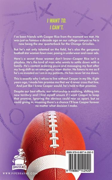 I want to. I can't. I've been friends with Cooper Rice from the moment we met. He was just as famous a decade ago on our college campus as he is now being the star quarterback for the Chicago Grizzlies. But he's not only talented on the field, he's also the gorgeous football star women fawn over, posing in underwear and razor ads. Here's a secret those women don't know-Cooper Rice isn't a playboy. He's the kind of man who wants to settle down with a family. He's content ordering pizza and massaging my feet after my long shift as an emergency room doctor. He listens to me as if he's as invested as I am in my patients. He has never let me down. This is exactly why I refuse to live without Cooper in my life. Eight years ago, I made him promise me that we'd never cross that line. And just like I knew Cooper would, he's held to that promise. Despite our best efforts, our relationship is evolving, shifting into new territory and I find myself unsure if I want Cooper to keep that promise. Ignoring the obvious could tear us apart, but so could giving in, meaning there's a chance I'll lose Cooper forever no matter what decision I make.