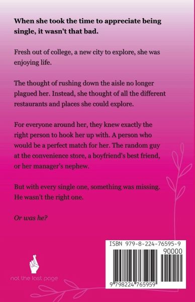 When she took the time to appreciate being single, it wasn't that bad. Fresh out of college, a new city to explore, she was enjoying life. The thought of rushing down the aisle no longer plagued her. Instead she thought of all the different restaurants and places she could explore. But for everyone around her, they knew exactly the right person to hook her up with. A person who would be a perfect match for her. The random guy at the convenience store, a boyfriend's best friend, or her manager's nephew. But with every single one, something was missing. He wasn't the right one. Or was he?