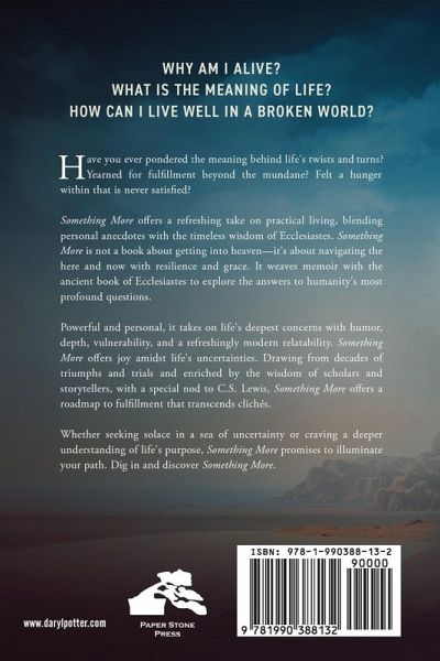 Why am I alive? What is the meaning of life? How can I live well in a broken world? Have you ever pondered the meaning behind life's twists and turns? Yearned for fulfillment beyond the mundane? Felt a hunger within that is never satisfied? Something More offers a refreshing take on practical living, blending personal anecdotes with the timeless wisdom of Ecclesiastes. Something More is not a book about getting into heaven-it's about navigating the here and now with resilience and grace. It weaves memoir with the ancient book of Ecclesiastes to explore the answers to humanity's most profound questions. Powerful and personal, it takes on life's deepest concerns with humor, depth, vulnerability, and a refreshingly modern relatability. Something More offers joy amidst life's uncertainties. Drawing from decades of triumphs and trials and enriched by the wisdom of scholars and storytellers, with a special nod to C.S. Lewis, Something More offers a roadmap to fulfillment that transcends clichés. Whether seeking solace in a sea of uncertainty or craving a deeper understanding of life's purpose, Something More promises to illuminate your path. Dig in and discover Something More