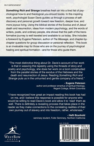 Something Rich and Strange breathes fresh air into a tired list of psychological how-to and theological you-should books. In this inspiring work, psychologist Susan Davis guides us through a process of self-discovery and personal growth toward new freedom, deeper love, and more joyous living. Using the biblical stories of the Exodus and of Jesus' death and resurrection, ideas from modern psychology, and the words of writers, poets, and ordinary people, she shows that the path of the transformative journey is well traveled and available to us today. She includes a foreword by Eugene Peterson, author of The Message, and chapter-by-chapter questions for group discussion or personal reflection. This book is an invaluable map for those who are on the journey of psychological healing and spiritual formation-and for those who guide them. "The most distinctive thing about Dr. Davis’s account of her work is that in weaving this tapestry using the threads of story and poetry and psychology, she does her work on a loom constructed from the parallel stories of the exodus of the Hebrews and the death and resurrection of Jesus. Reading Something Rich and Strange puts us in the unhurried and gentle company of a friend." —Eugene Peterson, author and professor emeritus of spiritual theology, Regent College, British Columbia "I have recognized how great an impact reading this book has had on me, and I believe this response is possible for anyone who would be willing to read Davis’s book and allow it to ‘read’ them as well. There is definitely a revealing process that takes place in the reader as they make connections to the correlating realities of their own journey out of slavery and into freedom, rather, wholeness." —Hefti Brunhold, seminary student, Fuller Seminary, Northern California