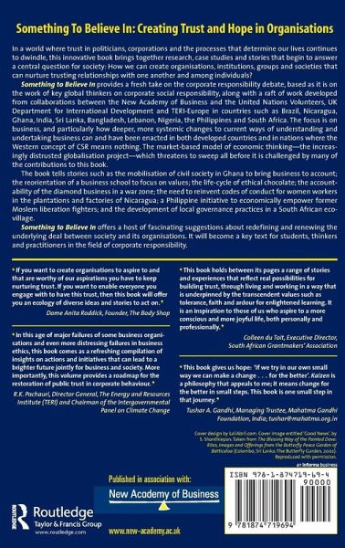 In a world where trust in politicians, corporations and the processes that determine our lives continues to dwindle, this innovative book brings together research, case studies and stories that begin to answer a central question for society: How we can create organisations, institutions, groups and societies that can nurture trusting relationships with one another and among individuals?Something to Believe In provides a fresh take on the corporate responsibility debate, based as it is on the work of key global thinkers on corporate social responsibility, along with a raft of work developed from collaborations between the New Academy of Business and the United Nations Volunteers, UK Department for International Development and TERI-Europe in countries such as Brazil, Nicaragua, Ghana, India, Sri Lanka, Bangladesh, Lebanon, Nigeria, the Philippines and South Africa. The focus is on business, and particularly how deeper, more systemic changes to current ways of understanding and undertaking business can and have been enacted in both developed countries and in nations where the Western concept of CSR means nothing. The market-based model of economic thinking-the increasingly distrusted globalisation project-which threatens to sweep all before it is challenged by many of the contributions to this book.The book tells stories such as the mobilization of civil society in Ghana to bring business to account; the reorientation of a business school to focus on values; the life-cycle of ethical chocolate; the accountability of the diamond business in a war zone; the need to reinvent codes of conduct for women workers in the plantations and factories of Nicaragua; a Philippine initiative to economically empower former Moslem liberation fighters; and the development of local governance practices in a South African eco-village.The book is split into four sections. "Through Some Looking Glasses" contains short, thought-provoking pieces about the issues of trust, belief and change from writers including Thabo Mbeki, Malcolm McIntosh and a reprinted piece from E.M. Forster. Section Two asks how it will be possible to believe in our corporations and provides new approaches from around the world on how space is being opened up to found businesses that are able to create trust. Section Three examines the role of auditing in fostering trust. Corporations continue to attempt to engender trust through their activities in philanthropy, reporting and voluntary programmes. But, post-Enron et al., even the most highly praised corporate mission statements are tarnished. Can social and environmental audits of corporate reports, codes and practices assuage our doubts about boardroom democracy? Section Four examines alternative forms of accountability, transparency and governance from around the world and offers some different ways of thinking about the practice of creating trust in society.Something to Believe In provides a host of fascinating suggestions about redefining and renewing the underlying deal between society and its organizations. It will become a key text for students, thinkers and practitioners in the field of corporate responsibility.
