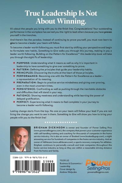 True leadership is not about winning. It's about the people you bring with you to the finish line. Congratulations! Your outstanding performance in the workplace has earned you the right to lead others because you have proven yourself in the trenches. And therein lies the paradox. Instead of continuing to prove yourself, you must now learn to give to become a leader your team will follow. To become a leader worth following you must first start by shifting your perspective and begin to formulate new habits. Something to Give walks you through this journey, making in you a leader worth following. Building on the Pattern for ExcellenceTM this leadership book will take you through the eight Ps of leadership:PURPOSE: Understanding what it means as well as why it is important in leadership to have something to give over something to prove. PATTERN: Defining the principles that guide your leadership habits. PRINCIPLES: Discovering the truths at the heart of those principles. PERFORMANCE: Becoming one with the Pattern for Excellence as a leader-a representation of its meaning. PREPARATION: Begin to practice service mindedness and giving over proving, even in the most uncertain times. PERSISTENCE: Confronting as well as pushing through the inevitable obstacles and difficulties that will stand in your way. PATIENCE: Showing meekness and understanding while learning the power of delayed gratification. PERFECT: Experiencing what it means to feel complete in your journey to become a leader worth following. Lasting change starts from the top. No one on your team will follow your lead if you are not living the change you want to see in them. Something to Give will show you how to bring your people with you to the finish line!