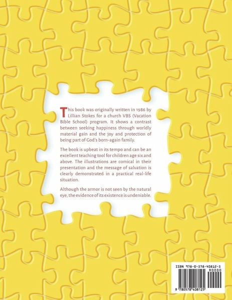 This book was originally written in 1986 by Lillian Stokes for a church VBS (Vacation Bible School) program. It shows a contrast between seeking happiness through worldly material gain and the joy and protection of being part of God's born-again family. The book is upbeat in its tempo and can be an excellent teaching tool for children age six and above. The illustrations are comical in their presentation and the message of salvation is clearly demonstrated in a practical real-life situation. Although the armor is not seen by the natural eye, the evidence of its existence is undeniable.