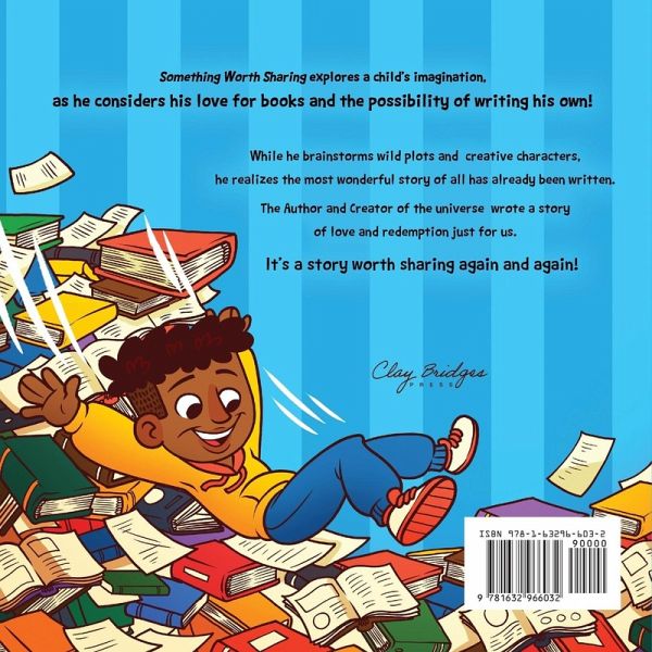 Something Worth Sharing explores a child's imagination, as he considers his love for books and the possibility of writing his own! While he brainstorms wild plots and creative characters, he realizes the most wonderful story of all has already been written. The Author and Creator of the universe wrote a story of love and redemption just for us. It's a story worth sharing again and again!