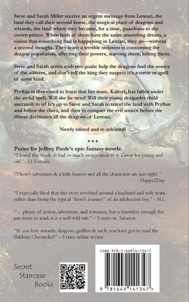 Steve and Sarah Miller receive an urgent message from Lentari, the land they call their second home, the magical place of dragons and wizards, the land where they became, for a time, guardians to the crown prince. When both of them have the same unsettling dream, a vision that something bad is happening in Lentari, they go-without a second thought. They learn a terrible sickness is consuming the dragon population, affecting their powers, starving them, killing them. Steve and Sarah arrive with two goals: help the dragons find the source of the ailment, and don't tell the king they suspect it's a curse or spell of some kind. Pryllan is distressed to learn that her mate, Kahvel, has fallen under the awful spell. Will she be next? Will their young dragonlet child succumb to it? It's up to Steve and Sarah to travel the land with Pryllan and follow the clues, and then to conquer the evil source before the illness decimates all the dragons of Lentari. Newly edited and re-released! * * * Praise for Jeffrey Poole's epic fantasy novels: "I loved this book. It had so much imagination to it. Great for young and old." - D. Estrada "There's adventure & a little humor and all the characters are just right. " - Happy2Day "I especially liked that this story revolved around a husband and wife team, rather than being the typical "hero's journey" of an adolescent boy." - M.L. "... plenty of action, adventure, and romance, but is harmless enough for pre-teens to read; it is a well-told tale." - 5 stars on Amazon "If you love wizards, dragons, griffins & such, you have got to read the Bakkian Chronicles!" - 5 stars online review