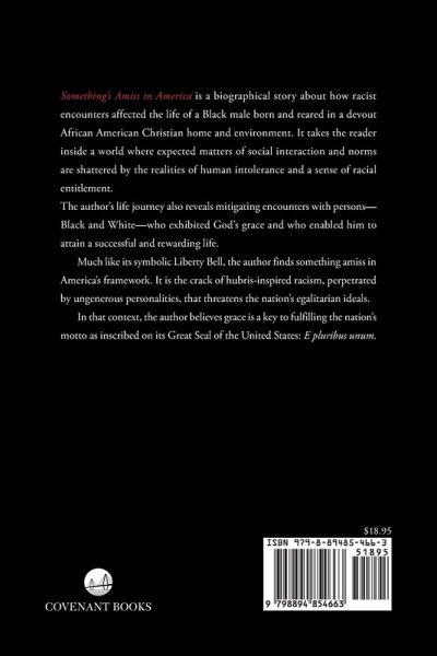 Something's Amiss in America is a biographical story about how racist encounters affected the life of a Black male born and reared in a devout African American Christian home and environment. It takes the reader inside a world where expected matters of social interaction and norms are shattered by the realities of human intolerance and a sense of racial entitlement. The author's life journey also reveals mitigating encounters with persons--Black and White--who exhibited God's grace and who enabled him to attain a successful and rewarding life. Much like its symbolic Liberty Bell, the author finds something amiss in America's framework. It is the crack of hubris-inspired racism, perpetrated by ungenerous personalities, that threatens the nation's egalitarian ideals. In that context, the author believes grace is a key to fulfilling the nation's motto as inscribed on its Great Seal of the United States: E pluribus unum.