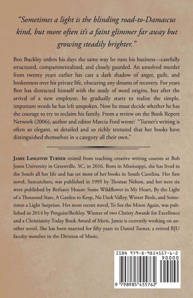"Sometimes a light is the blinding road-to-Damascus kind, but more often it's a faint glimmer far away but growing steadily brighter." Ben Buckley orders his days the same way he runs his business-carefully structured, compartmentalized, and closely guarded. An unsolved murder from twenty years earlier has cast a dark shadow of anger, guilt, and brokenness over his private life, obscuring any dreams of recovery. For years Ben has distracted himself with the study of word origins, but after the arrival of a new employee, he gradually starts to realize the simple, important words he has left unspoken. Now he must decide whether he has the courage to try to reclaim his family. From a review on the Book Report Network (2006), author and editor Marcia Ford wrote: "Turner's writing is often so elegant, so detailed and so richly textured that her books have distinguished themselves in a category all their own."