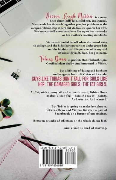 Vivien Leigh Martin is a mess. She's chronically late, stubborn, and cynical. She spends her time solving other people's problems as the campus relationship expert but studiously ignores her own. She knows she'll never be able to live up to her namesake or her mother's exacting standards. Vivien reinvented herself when she moved away to college, and she hides her insecurities under green hair and the louder-than-life persona of brassy and vivacious Bryn St. Jean, her pen name. Tobias Doan is perfect. Hot. Philanthropic. Certified plant daddy. And interested in Vivien. But a lifetime of dating and hookups and hang-ups have left Vivien with a code: guys like Tobias don't fall for girls like her. The damaged girls. The fat girls. At 6'6, with a ponytail and a poet's heart, Tobias Doan makes Vivien feel-dare she say it-dainty. And worthy. And wanted. But Tobias is going to make her choose. Between Bryn and Vivien. Between a past of heartbreak or a future of uncertainty. Between crumbs of affection or the whole damn loaf. And Vivien is tired of starving.