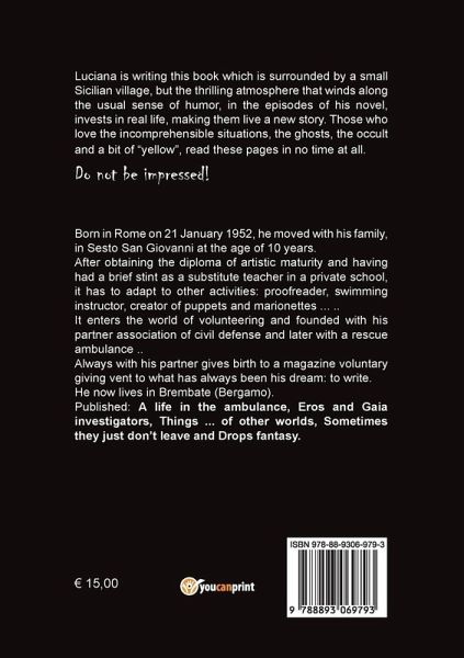 Luciana is writing this book which is surrounded by a small Sicilian village, but the thrilling atmosphere that winds along the usual sense of humor, in the episodes of her novel, invests in real life, making them live a new story. Those who love the incomprehensible situations, the ghosts, the occult and a bit of "yellow", read these pages in no time at all.