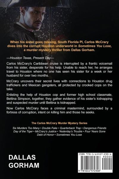 When His Sister Goes Missing, South Florida, Pi, Carlos McCrary Dives into the Corrupt Houston Underworld in Sometimes You Lose, a Murder Mystery Thriller from Dallas Gorham. -Houston Texas, Present Day- Carlos McCrary's Caribbean cruise is interrupted by a frantic voicemail from his sister, desperate for his help. Unable to reach her, he arranges travel to Houston where no one has seen his sister for a week or her husband for over two months. McCrary uncovers their secret lives with connections to Houston drug traffickers and Mexican gangsters, all protected by crooked cops on the take. Enlisting the help of Houston cop and former high school classmate, Bettina Simpson, together, they gather evidence of his sister's kidnapping and suspected murder until Bettina is kidnapped. Now Carlos McCrary faces a criminal mastermind, surrounded by a fortress of corruption, intent on killing him and those he seeks. Publisher's Note: Dallas Gorham combines murder, mystery, and mayhem with a touch of humor-all with a PG-13 rating. The Carlos McCrary, Private Investigator, Mystery Thriller Series can be read and enjoyed in any order. Readers of hard-boiled detective and crime novels will not want to miss this hard-hitting, pulse-pounding series. The Carlos McCrary Murder Mystery Series Six Murders Too Many Double Fake Quarterback Trap Dangerous Friends Day of the Tiger McCrary's Justice Yesterday's Trouble Four Years Gone Debt of Honor Sometimes You Lose