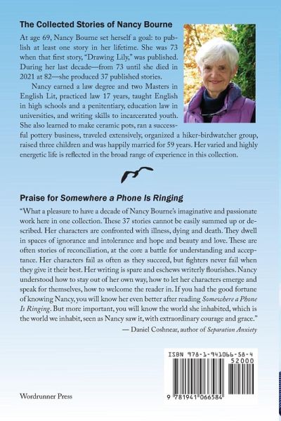 Somewhere a Phone Is Ringing: The Collected Stories of Nancy Bourne At age 69, Nancy Bourne set herself a goal: to publish at least one story in her lifetime. She was 73 when that first story, "Drawing Lily," was published. During her last decade-from seventy-three until she died in 2021 at eighty-two-Nancy produced thirty-seven published stories (the last one published posthumously, in 2022), with remarkably varied settings and human predicaments. Examples: A lawyer in a small 1960s southern town pretends his political campaign is not racist ("Massive Resistance"). Touring Iran, an autistic expert on Persian art falls prey to religious police ("Stalking the Sprouted Stag"). In juvie for dealing drugs, a girl sends her friend's brother to the penitentiary and deftly punishes a teacher she distrusts ("American Girl"). A widower's demands that his daughter preserve her chastity contribute to her death, racking him with guilt ("A Case for Wrongful Death"). Her final story, "Somewhere a Phone Is Ringing," offers a measure of respite from the anguish of impending death.