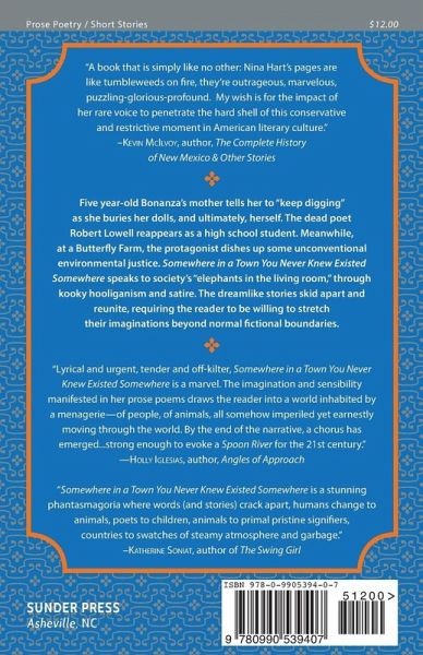 Somewhere in a Town You Never Knew Existed Somewhere is a book that speaks directly to society's "elephants in the living room," through kooky hooliganism and satire. Five year-old Bonanza's mother tells her to "keep digging" as she buries her dolls, and ultimately, herself. The dead poet Robert Lowell reappears as a high school student. Meanwhile, at a Butterfly Farm, the protagonist dishes up some unconventional environmental justice. Even the ones who kill with oil spills have a voice in this bizarre primer of the exquisite, the mundane, and the insane. Written in an improvisatory manner, characters in Somewhere In A Town You Never Knew Existed Somewhere skid apart and reunite, stories connect and disconnect. The stories are raw and dreamlike, breaking time/space reality rules, committing literary misdemeanors and requiring the reader not only have an imagination but to be willing to stretch it beyond normal fictional boundaries. Somewhere In A Town You Never Knew Existed Somewhere not only pushes the edges of writing, but also is willing to go to the dark and often taboo topics that haunt us in our dreams and waking life, breathing vitality back into the suffocation we as a collective experience around the issues of ecology, education, childhood, play, and animal rights. An important dialogue written with political overtones, the book manages to be intimate, deeply vulnerable, and very funny.