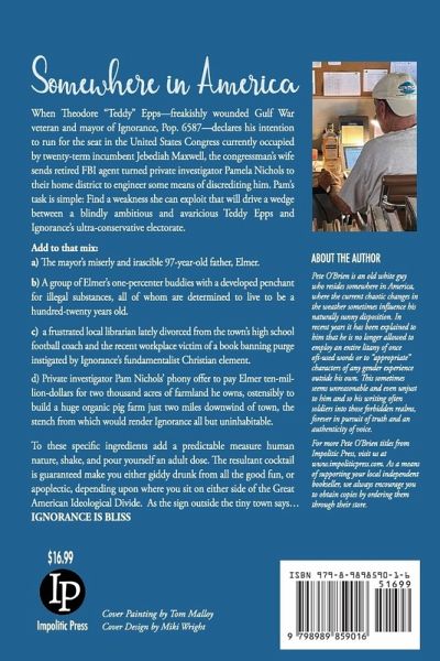 When Theodore "Teddy" Epps-freakishly wounded Gulf War veteran and mayor of Ignorance, Pop. 6587-declares his intention to run for the seat in the United States Congress currently occupied by twenty-term incumbent Jebediah Maxwell, the congressman's wife sends retired FBI agent turned private investigator Pamela Nichols to their home district to engineer some means of discrediting him. Pam's task is simple: Find a weakness she can exploit that will drive a wedge between a blindly ambitious and avaricious Teddy Epps and Ignorance's ultra-conservative electorate. Add to that mix: a) The mayor's miserly and irascible 97-year-old father, Elmer. b) A group of Elmer's one-percenter buddies with a developed penchant for illegal substances, all of whom are determined to live to be a hundred-twenty years old. c) a frustrated local librarian lately divorced from the town's high school football coach and the recent workplace victim of a book banning purge instigated by Ignorance's fundamentalist Christian element. d) Private investigator Pam Nichols' phony offer to pay Elmer ten-million-dollars for two thousand acres of farmland he owns, ostensibly to build a huge organic pig farm just two miles downwind of town, the stench from which would render Ignorance all but uninhabitable. To these specific ingredients add a predictable measure human nature, shake, and pour yourself an adult dose. The resultant cocktail is guaranteed make you either giddy drunk from all the good fun, or apoplectic, depending upon where you sit on either side of the Great American Ideological Divide. As the sign outside the tiny town says: IGNORANCE IS BLISS