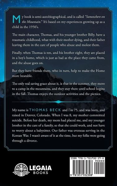 My book is semi-autobiographical, and is called "Somewhere on the Mountain." It's based on my experiences growing up as a child in the 1950's..The main character, Thomas, and his younger brother Billy, have a traumatic childhood, what with their mother dying, and their father leaving them in the care of people who abuse and molest them.Finally, when Thomas is ten, and his brother eight, they are placed in a boy's home, which is just as bad as the place they came from, and the abuse goes on.But they have friends there, who in turn, help to make the Home more bearable.The only realsaving grace about it, is that in the summer, they move to a camp in the mountains, and they stay there until school begins in the fall. Thomas enjoys the outdoor activities and the picnics.