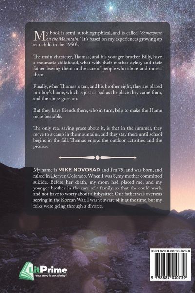 My book is semi-autobiographical, and is called "Somewhere on the Mountain." It's based on my experiences growing up as a child in the 1950's. The main character, Thomas, and his younger brother Billy, have a traumatic childhood, what with their mother dying, and their father leaving them in the care of people who abuse and molest them. Finally, when Thomas is ten, and his brother eight, they are placed in a boy's home, which is just as bad as the place they came from, and the abuse goes on. But they have friends there, who in turn, help to make the Home more bearable. The only real saving grace about it, is that in the summer, they move to a camp in the mountains, and they stay there until school begins in the fall. Thomas enjoys the outdoor activities and the picnics.