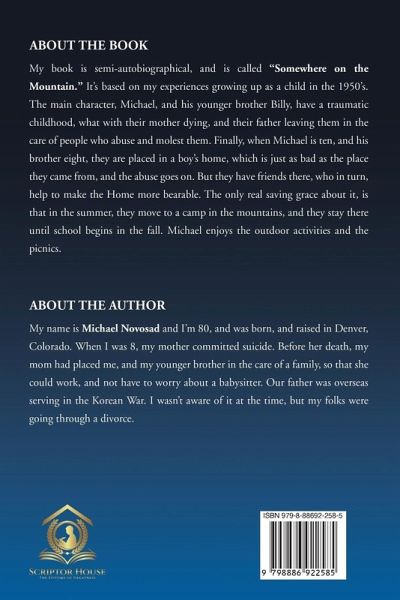 My book is semi-autobiographical, and is called "Somewhere on the Mountain." It's based on my experiences growing up as a child in the 1950's. The main character, Michael, and his younger brother Billy, have a traumatic childhood, what with their mother dying, and their father leaving them in the care of people who abuse and molest them. Finally, when Michael is ten, and his brother eight, they are placed in a boy's home, which is just as bad as the place they came from, and the abuse goes on. But they have friends there, who in turn, help to make the Home more bearable. The only real saving grace about it, is that in the summer, they move to a camp in the mountains, and they stay there until school begins in the fall. Michael enjoys the outdoor activities and the picnics.