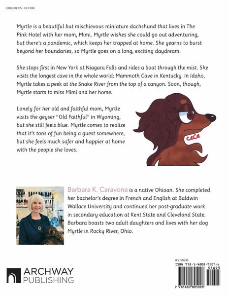 Myrtle is a beautiful but mischievous miniature dachshund that lives in The Pink Hotel with her mom, Mimi. Myrtle wishes she could go out adventuring, but there's a pandemic, which keeps her trapped at home. She yearns to burst beyond her boundaries, so Myrtle goes on a long, exciting daydream. She stops first in New York at Niagara Falls and rides a boat through the mist. She visits the longest cave in the whole world: Mammoth Cave in Kentucky. In Idaho, Myrtle takes a peek at the Snake River from the top of a canyon. Soon, though, Myrtle starts to miss Mimi and her home. Lonely for her old and faithful mom, Myrtle visits the geyser "Old Faithful" in Wyoming, but she still feels blue. Myrtle comes to realize that it's tons of fun being a guest somewhere, but she feels much safer and happier at home with the people she loves.