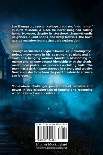 Deep in the cellar of somewhere, secrets lurk. Somewhere challenges perceptions of paradise and power in this gripping tale of longing and reckoning with the sins of our ancestors. Lee Thompson, a recent college graduate, finds himself in rural Missouri, a place he never imagined calling home. However, despite its storybook charm-friendly neighbors, quaint shops, and lively festivals-the town guards macabre secrets that defy explanation. Strange occurrences begin to haunt Lee, including mysterious movements in his apartment at night and visions of a hanging woman. Amidst a blossoming romance and an unexpected friendship with the charismatic local pastor, Lee uncovers a chilling truth: The town has a dark history steeped in slavery and cruelty. Now, a sinister force from the past threatens to ensnare Lee forever.