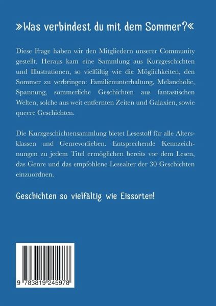 Was verbindest du mit dem Sommer? Diese Frage haben wir den Mitgliedern unserer Community gestellt. Heraus kam eine Sammlung aus Kurzgeschichten und Illustrationen, so vielfältig wie die Möglichkeiten, den Sommer zu verbringen: Familienunterhaltung, Melancholie, Spannung, sommerliche Geschichten aus fantastischen Welten, Geschichten aus weit entfernten Welten im Weltraum oder in der Zukunft, und LGBTQ-Geschichten. Die Kurzgeschichtensammlung bietet Lesestoff für alle Altersklassen und Genrevorlieben. Entsprechende Kennzeichnungen zu jedem Titel ermöglichen bereits vor dem Lesen, das Genre und das empfohlene Lesealter der Geschichten einzuordnen. Geschichten so vielfältig wie Eissorten!