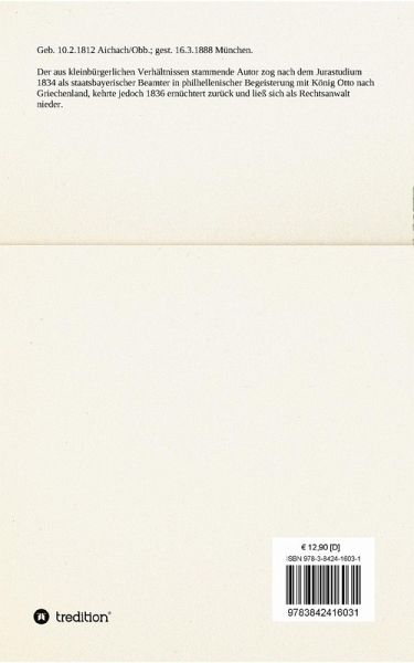 Geb. 10.2.1812 Aichach/Obb.; gest. 16.3.1888 München. Der aus kleinbürgerlichen Verhältnissen stammende Autor zog nach dem Jurastudium 1834 als staatsbayerischer Beamter in philhellenischer Begeisterung mit König Otto nach Griechenland, kehrte jedoch 1836 ernüchtert zurück und ließ sich als Rechtsanwalt nieder.