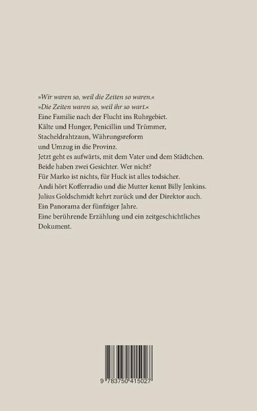 "Wir waren so, weil die Zeiten so waren.""Die Zeiten waren so, weil ihr so wart."Eine Familie nach der Flucht ins Ruhrgebiet.Kälte und Hunger, Penicillin und Trümmer, Stacheldrahtzaun, Währungsreform und Umzug in die Provinz.Jetzt geht es aufwärts, mit dem Vater und dem Städtchen. Beide haben zwei Gesichter. Wer nicht?Für Marko ist nichts, für Huck ist alles todsicher.Andi hört Kofferradio und die Mutter kennt Billy Jenkins.Julius Goldschmidt kehrt zurück und der Direktor auch.Ein Panorama der fünfziger Jahre.Eine berührende Erzählung und ein zeitgeschichtliches Dokument.