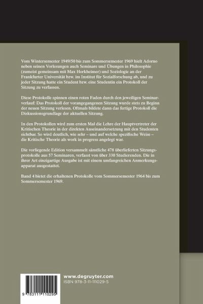 Vom Wintersemester 1949/50 bis zum Sommersemester 1969 hielt Adorno Seminare und Übungen in Philosophie und Soziologie an der Frankfurter Universität bzw. im Institut für Sozialforschung ab, und von jeder Sitzung hatte ein Student bzw. eine Studentin ein Protokoll zu verfassen. Band 4 bietet die erhaltenen Protokolle vom Sommersemester 1964 bis zum Sommersemester 1969.