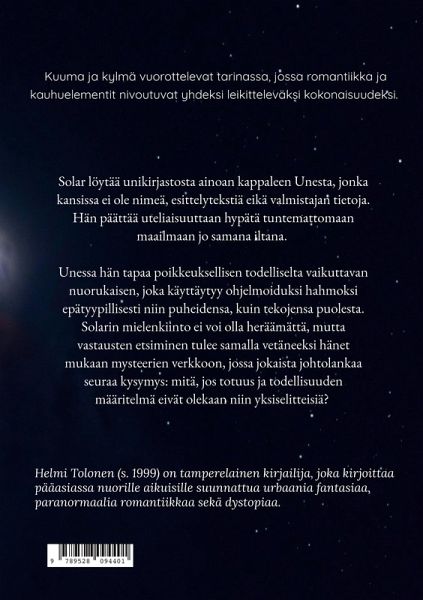 Solar löytää unikirjastosta ainoan kappaleen Unesta, jonka kansissa ei ole nimeä, esittelytekstiä eikä valmistajan tietoja. Hän päättää uteliaisuuttaan hypätä tuntemattomaan maailmaan jo samana iltana. Unessa hän tapaa poikkeuksellisen todelliselta vaikuttavan nuorukaisen, joka käyttäytyy ohjelmoiduksi hahmoksi epätyypillisesti niin puheidensa, kuin tekojensa puolesta. Solarin mielenkiinto ei voi olla heräämättä, mutta vastausten etsiminen tulee samalla vetäneeksi hänet mukaan mysteerien verkkoon, jossa jokaista johtolankaa seuraa kysymys: mitä, jos totuus ja todellisuuden määritelmä eivät olekaan niin yksiselitteisiä?