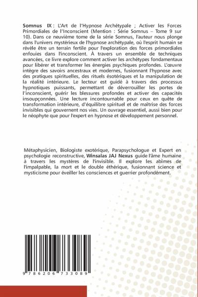 Somnus IX : L'Art de l'Hypnose Archétypale ; Activer les Forces Primordiales de l'Inconscient (Mention : Série Somnus - Tome 9 sur 10). Dans ce neuvième tome de la série Somnus, l'auteur nous plonge dans l'univers mystérieux de l'hypnose archétypale, où l'esprit humain se révèle être un terrain fertile pour l'exploration des forces primordiales enfouies dans l'inconscient. À travers un ensemble de techniques avancées, ce livre explore comment activer les archétypes fondamentaux pour libérer et transformer les énergies psychiques profondes. L'oeuvre intègre des savoirs ancestraux et modernes, fusionnant l'hypnose avec des pratiques spirituelles, des rituels ésotériques et la manipulation de la réalité intérieure. Le lecteur est guidé à travers des processus hypnotiques puissants, permettant de déverrouiller les portes de l'inconscient, guérir les blessures profondes et activer des capacités insoupçonnées. Une lecture incontournable pour ceux en quête de transformation intérieure, d'équilibre spirituel et de maîtrise des forces invisibles qui gouvernent nos vies. Un ouvrage essentiel, aussi bien pour le néophyte que pour l'expert en hypnose et développement personnel.
