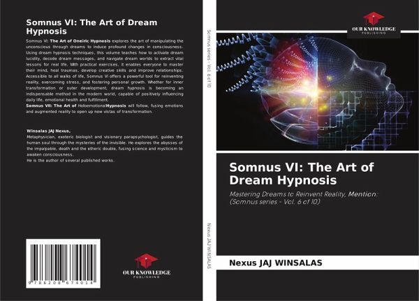 Somnus VI: The Art of Oneiric Hypnosis explores the art of manipulating the unconscious through dreams to induce profound changes in consciousness. Using dream hypnosis techniques, this volume teaches how to activate dream lucidity, decode dream messages, and navigate dream worlds to extract vital lessons for real life. With practical exercises, it enables everyone to master their mind, heal traumas, develop creative skills and improve relationships. Accessible to all walks of life, Somnus VI offers a powerful tool for reinventing reality, overcoming stress, and fostering personal growth. Whether for inner transformation or outer development, dream hypnosis is becoming an indispensable method in the modern world, capable of positively influencing daily life, emotional health and fulfillment.Somnus VII: The Art of HoloemotionalHypnosis will follow, fusing emotions and augmented reality to open up new vistas of transformation.